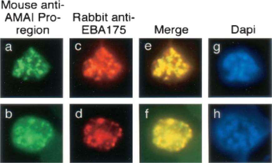Single and dual indirect immunofluorescence images showing the same subcellular localization of AMA1 and EBA-175 in two mature schizonts of P. falciparum. (a to d) FITC-labeled MAb 5G8 against the PfAMA1 pro-region (a and b) and rhodamine-labeled anti-EBA175 (c and d). (e and f) Merged images show full-length AMA1 colocalized with EBA175. (g and h) DAPI-stained parasites included to show the stage of merozoite development. MAb 5G8, which specifically recognizes the unprocessed form of AMA1, showed a punctate pattern characteristic of the apical organelles of merozoites (a and b). Anti-EBA175 antibodies showed the same pattern (c and d), and merging of the images from the FITC and rhodamine channels suggested that these two proteins were colocalized in the same subcellular compartment, the micronemes.Healer J, Crawford S, Ralph S, McFadden G, Cowman AF. Independent translocation of two micronemal proteins in developing Plasmodium falciparum merozoites. Infect Immun. 2002 70:5751-8.