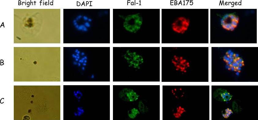 Falcipain 1 and EBA-175 (a merozoite microneme protein) co-localized at the schizont stage. Immunofluorescence images of fixed 3D7 P. falciparum parasites. (A) Merozoites costained with anti-F1.4 and anti-EBA-175 antibodies. (B) Schizonts costained with anti-F1.4 and anti-EBA-175 antibodies. (C) Merozoites costained with anti-F1.4 and anti-MSP-119 antibodies.Kumar A, Kumar K, Korde R, Puri SK, Malhotra P, Singh Chauhan V. Falcipain-1, a Plasmodium falciparum cysteine protease with vaccine potential. Infect Immun. 2007 75:2026-34.