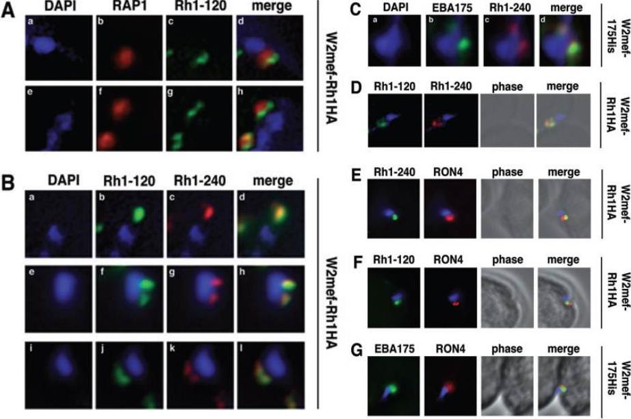 Schizont-processed Rh1-240 colocalizes with Rh1-120 at the apical tip and tight junction of the merozoite. A. The Rh1-120 protein is located at the apical tip and tight junction of merozoites. Free merozoites from the W2mef-Rh1HA line were dual stained with a McAb to RAP1 in the body of the rhoptry and with rat anti-HA antibodies to the tagged 120 kDa Rh1. Anti-HA staining is seen either apical to the RAP1 staining (top panels) or at both sides but posterior to RAP1 staining indicating tight junction staining (bottom panels). Nuclei were stained with DAPI. B. The Rh1-120 protein colocalizes with the Rh1-240 protein at the apical tip and tight junction of merozoites. Free merozoites from the W2mef-Rh1HA line were dual-stained with rat anti-HA antibodies to the tagged 120 kDa Rh1 and with a rabbit antibody (R515) to the 240 kDa Rh1. Colocalization is seen at the apical tip (panels a–d) and at the tight junction (panels e–l) of individual merozoites. W2mef-175His line C. The Rh1-240 protein colocalizes with EBA-175 MAL7P1.176 at the tight junction of merozoites. Free merozoites were dual-stained with mouse anti-His antibodies to tagged EBA-175 and with a rabbit antibody to the 240 kDa Rh1. EBA-175 and Rh1-240 appear to colocalize at the tight junction. D. Free merozoites were dual-stained with rat anti-HA antibodies to the tagged 120 kDa Rh1 and with a rabbit antibody to the 240 kDa Rh1. Simultaneous staining of both the apical tip and the tight junction of a merozoite is seen. E–G. Merozoites were trapped during invasion using cytochalasin D. Rh1-240 was stained with R515, Rh1-120 with rat anti-HA and EBA-175 with mouse anti-His antibodies. PfRON4 was stained either with a mouse antibody (E) or with a rabbit antibody (F and G). Triglia T, Tham WH, Hodder A, Cowman AF. Reticulocyte binding protein homologues are key adhesins during erythrocyte invasion by Plasmodium falciparum. Cell Microbiol. 2009 11:1671-87. Copyright John Wiley & Sons Ltd. 2010.