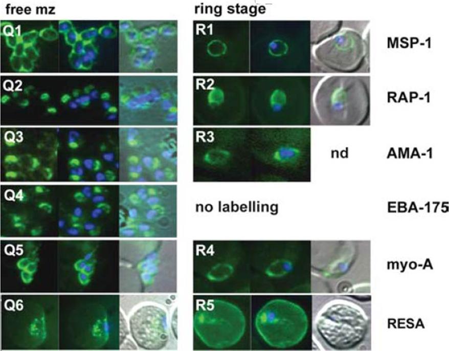 The appearance of Plasmodium falciparum merozoites and rings of the ITO4 line at different times of development. Antibodies to proteins associated with invasion related organelles or the parasite periphery (rhoptries : RAP-1; micronemes: AMA-1, EBA-175; dense granules: RESA; parasite periphery: MSP-1, myo-A) were chosen to follow the development and assembly of merozoites and rings.Margos G, Bannister LH, Dluzewski AR, Hopkins J, Williams IT, Mitchell GH. Correlation of structural development and differential expression of invasion-related molecules in schizonts of Plasmodium falciparum. Parasitology. 2004 129:273-87. Copyright Cambridge University Press Journals 2011