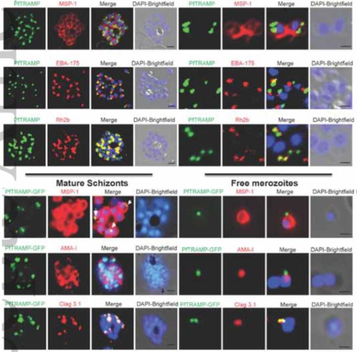PfTRAMP localizes to the rhoptries of P. falciparum schizonts and merozoites.(A) Co-localization of PfTRAMP with MSP1, EBA175 and Rh2b in schizonts and free merozoites by IFA. PfTRAMP (green) co-localizes with rhoptry marker PfRh2b (red) but does not co-localize with EBA175 (red) or merozoite surface marker MSP1 (red) in schizonts and merozoites. (B)Co-localization of PfTRAMP-GFP in transgenic P. falciparum 3D7 with MSP1, AMA1 and Clag3.1. PfTRAMP-GFP (green) co-localizes with rhoptry marker Clag 3.1 (red) but not with microneme markerPfAMA1 (red) or merozoite suface marker PfMSP1 (red) in schizonts and merozoites. Nuclei were stained with DNA intercalating dye DAPI.Siddiqui FA, Dhawan S, Singh S, Singh B, Gupta P, Pandey A, Mohmmed A, Gaur D, Chitnis CE. A Thrombospondin Structural Repeat Containing Rhoptry Protein from Plasmodium falciparum Mediates Erythrocyte Invasion. Cell Microbiol. 2013 15(8):1341-56