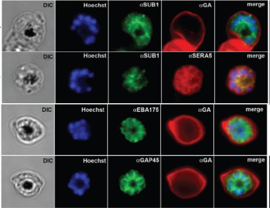 IFA of WT schizonts with glycophorin A (GA) labeled erythrocytes, localized SUB1 in an apical punctate pattern similar to SERA5. EBA-175 was detected in the apical ends of merozoites. GAP45 appeared submembrane. DIC, differential interference contrast; Hoechst = nucleic acid stain.Balu B, Maher SP, Pance A, Chauhan C, Naumov AV, Andrews RM, Ellis PD, Khan SM, Lin JW, Janse CJ, Rayner JC, Adams JH. CCR4-associated factor-1 coordinates expression of Plasmodium falciparum egress and invasion proteins. Eukaryot Cell. 2011 10(9):1257-63