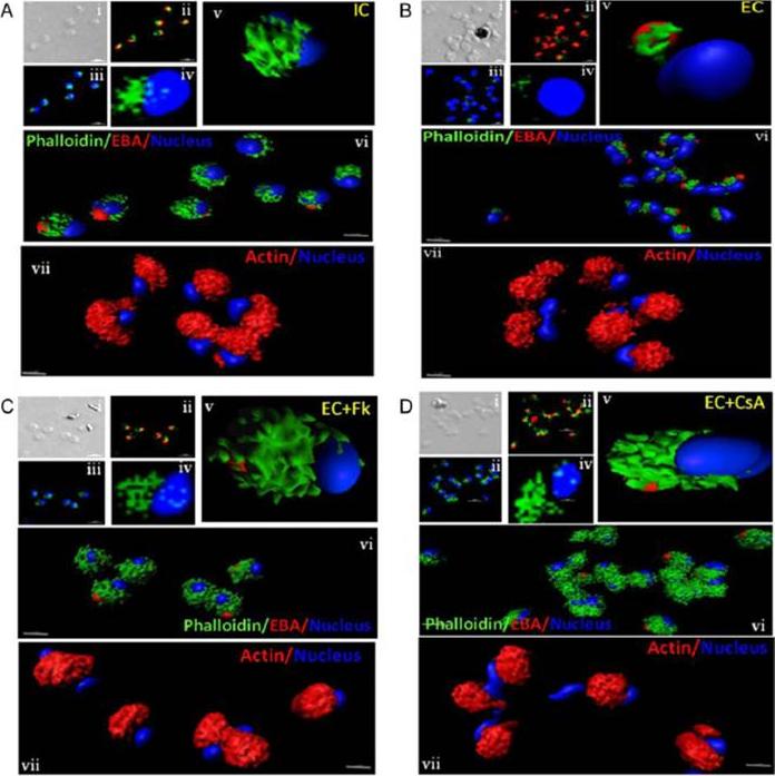 Actin polymerization status in P. falciparum merozoites. Merozoites were stained with Alexa 488-labeled phalloidin to detect polymerized F-actin (green), mouse anti EBA-175 mouse sera and Alexa Fluor 594-conjugated anti-mouse IgG goat antibodies to define location of micronemes (red) and DAPI to define location of nuclei (blue). Slides were observed under a confocal laser microscope (Nikon A1R). Bright field (i) and single slice confocal fluorescence images of merozoites (ii – iv) are shown. Three-dimensional reconstruction of confocal z stack fluorescence images of merozoites was performed using Imaris software (v –vii). Total actin (polymerized F-actin and monomeric G-actin) was detected with anti-actin rabbit sera followed by Alexa Fluor 594-conjugated anti-rabbit IgG goat antibodies (red in vii). Levels of total actin are similar in all conditions tested. Transfer of merozoites from IC to EC buffer leads to disassembly of polymerized F-actin at the apical tip of merozoites. Treatment of merozoites with FK506 and CsA prior to transfer to EC buffer leads to accumulation of polymerized actin at the apical end. Actin depolymerizing agent CytD and actin stabilizing agent JAS were used as control and result in reduced F-actin and increased F-actin at the apical tip of the merozoites respectively. Scale bar represents 1 μm. Treatment of merozoites with actin depolymerizing agents, CytD, ML-B and LA-B, resulted in increased secretion of microneme protein PfAMA-1 (a-c) whereas treatment with polymerized actin stabilizer JAS resulted in reduced secretion of PfAMA-1 (d).Singh S, More KR, Chitnis CE. Role of Calcineurin and Actin Dynamics in Regulated Secretion of Microneme Proteins in Plasmodium falciparum Merozoites during Erythrocyte Invasion. Cell Microbiol. 2013 16(1), 50–63