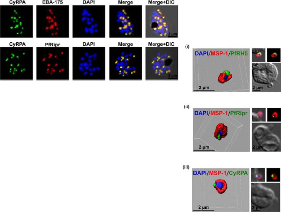 Left: Immunofluorescence microscopy detected CyRPA to colocalize with micronemal proteins (EBA-175, PfRipr). (Scale bar, 2 μm.)Right: PfRH5/PfRipr/CyRPA complex is GPI-anchored to the merozoite surface. (A) 3D reconstruction of IFA z-stacks during merozoite invasion, coimmunostained with MSP-1 detected PfRH5, PfRipr, and CyRPA at the apical end of the merozoite surface. In the 3D images, the γ settings were altered for visual representation only,Reddy KS, Amlabu E, Pandey AK, Mitra P, Chauhan VS, Gaur D. Multiprotein complex between the GPI-anchored CyRPA with PfRH5 and PfRipr is crucial for Plasmodium falciparum erythrocyte invasion. Proc Natl Acad Sci U S A. 2015 Jan 12.