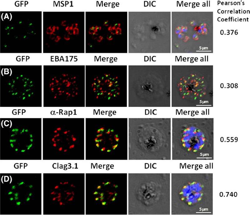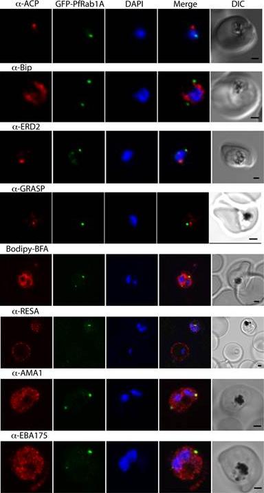 GFP-PfRab1A fluorescence does not co-localize with ER/Golgi, dense granules or microneme markers. GFP-PfRab1A fluorescence is distinct from the localization of markers for the apicoplast (ACP), the ER (Bip), the Golgi (ERD2 and GRASP), as well as from staining of the ER/Golgi with Bodipy BFA. GFP-Rab1A fluorescence is also distinct from the localization of markers for dense granules (RESA) or micronemes (AMA1 and EBA175).Morse D, Webster W, Kalanon M, Langsley G, McFadden GI. Plasmodium falciparum Rab1A Localizes to Rhoptries in Schizonts. PLoS One. 2016 Jun 27;11(6):e0158174