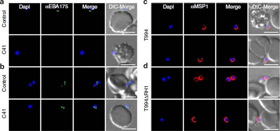 Effect of anti-PfRH1 inhibitory mAbs on merozoite surface expression of EBA175 during invasion. (a–d) Surface expression of EBA175 and MSP1 on T994 and T994DRH1 was detected by immunofluorescence assays. Isolated T994 (a,c) or T994DRH1 (b,d) merozoites were directly incubated with erythrocytes containing 4 mM Cyto D in the absence (Control) and presence (C41) of C41 (0.2mgml1) before analysis of expression of EBA175 and MSP1 at the junction. Both differential interference contrast (DIC) and fluorescence images were captured. Nuclear DNA was counterstained with DAPI (blue). EBA175 is shown in green, whereas MSP1 is shown in red. Fluorescence images, merged fluorescence images (DAPI and green or DAPI with red) and merged fluorescence images with DIC images are shown. Scale bars=10 mM. Antibody C41 blocks surface expression of EBA175 in T994 (a lower panel), whereas it has no effect on T994DRH1 parasites (b lower panel). In the absence of C41, EBA175 is expressed on the surface of both T994 and T994DRH1 (upper panels a,b). Ab has no effect on the detection of MSP1 on the surface of merozoites (c,d).Gao X, Gunalan K, Yap SS, Preiser PR. Triggers of key calcium signals during erythrocyte invasion by Plasmodium falciparum. Nat Commun. 2013;4:2862.
