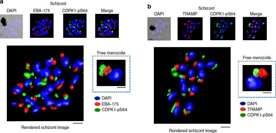 PfCDPK1 phosphorylated at serine-64 is associated with apical parasite structures. (a) A schizont stage parasite stained with DAPI to reveal the nuclei (blue), an antibody to PfEBA-175 to reveal the micronemes (red) and the phospho-specific CDPK1-pS64 antibody (green). A merge of images from all three stains is shown on the far right; this is a representative image from at least three experiments. Also shown is a rendered image where deconvoluted z stacks were reconstructed in 3D, with interpolation. The inset shows a rendered image of a free merozoite from the same preparation . (b) The same as a, but instead of probing with an anti-EBA-175 antibody the preparation was probed with an antibody to the rhoptrymarker PfTRAMP . Scale bars, a-1 mm (insert-0.5 mm), b-1 mm (insert-0.5 mm).Alam MM, Solyakov L, Bottrill AR, Flueck C, Siddiqui FA, Singh S, Mistry S, Viskaduraki M, Lee K, Hopp CS, Chitnis CE, Doerig C, Moon RW, Green JL, Holder AA, Baker DA, Tobin AB. Phosphoproteomics reveals malaria parasite Protein Kinase G as a signalling hub regulating egress and invasion. Nat Commun. 2015 6:7285