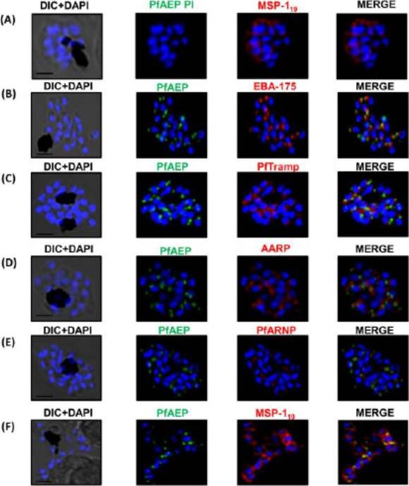 PfAEP localization in schizont stages analyzed by confocal microscopy. Subcellular localization of PfAEP was studied by co-staining with antibodies against micronemal protein EBA-175 (B), rhoptry bulb protein PTRAMP (C), and rhoptry neck,apical asparagine rich protein (AARP) (D), apical rhoptry neck protein (ARNP) (E), and merozoite surface protein (MSP) (F).As a control, pre-immune serum of PfAEP was checked and no staining was observed in schizonts (A). Mature schizonts were costained with anti-PfAEP (green) and anti-EBA-175, TRAMP, AARP, ARNP, MSP-119 antibodies (red). The nuclei of schizonts were stained with DAPI (blue) and visualized by Nikon N-SIM confocal microscope. All apical marker proteins and PfAEP showed punctate staining in schizonts distinct from DAPI. Co-staining of PfAEP with surface marker MSP-119 showed PfARNP localized at the apical tip with surface of merozoites stained by MSP-119. PfAEP staining did not merge with either markers of microneme or rhoptry indicating that PfAEP is neither a resident of micronemes or rhoptry ofmerozoites. Scale bar 2 mm.Hans N, Relan U, Dubey N, Gaur D, Chauhan VS. Identification and localization of a Novel Invasin of Plasmodium falciparum. Mol Biochem Parasitol. 2015 Sep 29. [Epub ahead of print]
