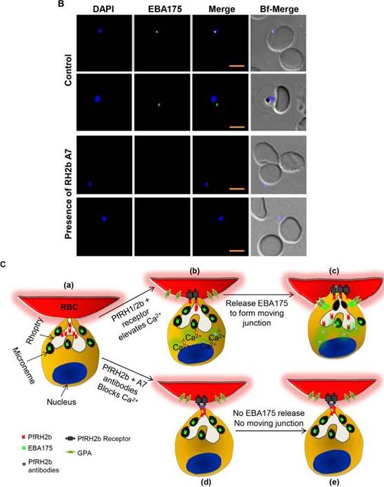 B. Representative images indicate the positivity of merozoites to EBA175 surface expression upon incubation with PfRH2b A7 or without A7 (Control). Merozoites nuclei shown in blue (DAPI) and EBA175 surface staining indicated in green color. Scale bar indicates 2 mm.C. Schematic of the effect of PfRH2b A7 on merozoite Ca2+ signalling and invasion. After the merozoite initially attaches to the RBC and reorient itself, PfRH2b is released from rhoptry neck aiding in the sensing of the RBC by engaging in apical end interaction with the surface of the RBC (a). The interaction between PfRH2b and its receptor triggers the increase of intracellular Ca2+ of the merozoite (b). The increase in cytosolic Ca2+ levels lead toa release of microneme proteins such as EBA175 to bind to its receptor glycophorin A (GPA). This therefore triggers the recruitment of other members leading to moving/tight junction formation (c). In the presence of PfRH2b A7 mAb, interactions between PfRH2b and its receptor is abrogated thereby affecting the intracellular Ca2+ increase (d) necessary for the release of EBA175. This, therefore, hinders recruitment of other proteins, such as AMA1,needed for merozoite tight junction formation. Hence no tight or moving junction is formed leading to invasion blocking.Aniweh Y, Gao X, Gunalan K, Preiser PR. PfRH2b Specific Monoclonal Antibodies Inhibit Merozoite Invasion. Mol Microbiol. 2016 Jul 20.