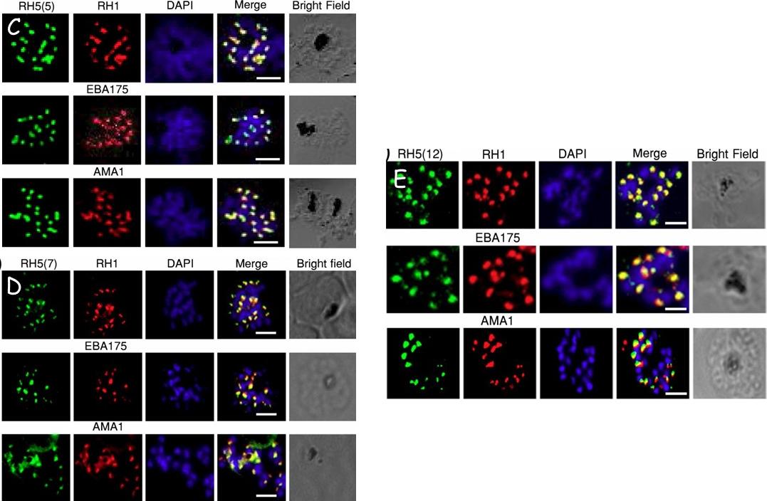 Validation of RH5 mAbs by Immunofluroscence Microscopy. Smears of 3D7 late stage schizont were co- stained with RH5(5) (c) (7) (d) and (12) (e) (first column, green) and antibodies against other invasion markers RH1, EBA175 and AMA1 respectively (second column, red). Parasite nuclei were stained with DAPI (blue). In the merged images, areas of overlap between the red and the green signals are shown in yellow. Bright field indicates the outline of the schizont. Scale bar =2μm.Aniweh Y, Gao X, Hao P, Meng W, Lai SK, Gunalan K, Chu TT, Sinha A, Lescar J, Chandramohanadas R, Li HY, Sze SK, Preiser PR. RH5-Basigin interaction induceschanges in the cytoskeleton of the host RBC. Cell Microbiol. 2017 Apr 13 [Epub ahead of print] PMID: 28409866