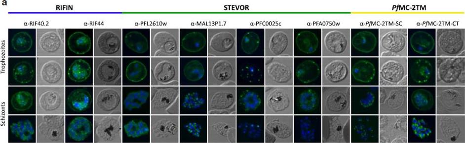 Localization of small VSA in infected erythrocytes using confocal immunofluorescence analysis. a Asexual parasites of the 3D7 parasite clone at the trophozoite and schizont stages were fixed with methanol and small VSA localization was visualized using antibodies directed against RIFIN (α-RIF40.2, α-RIF44), STEVOR (α-PFL2610w, α-MAL13P1.7, α-PFC0025c, α-PFA0750w) and PfMC-2TM (α-PfMC-2TM-SC, α-PfMC-2TM-CT) proteins (green). Nuclei were stained with Hoechst33342 (blue).Bachmann A, Scholz JA, Janßen M, Klinkert MQ, Tannich E, Bruchhaus I, Petter M. A comparative study of the localization and membrane topology of members of the RIFIN, STEVOR and PfMC-2TM protein families in Plasmodium falciparum-infected erythrocytes. Malar J. 2015 Jul 14:274.