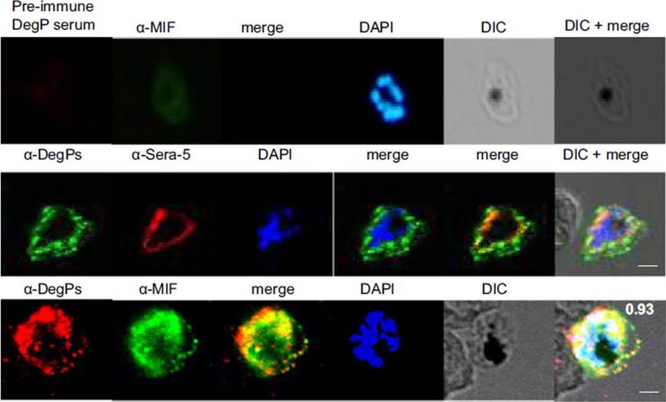 PfDegP exists in a multimeric complex, and is associated with parasite proteins Hsp70 and Eno. Parasites were stained with anti-DegP and anti-Hsp70 (B) or anti-Eno (C) antiserum; parasite nuclei were stained with 4′,6-diamidino-2-phenylindole (DAPI). Fluorescence signals from DegP and Hsp70 or Eno antibodies showed significant merging, with a co-localization coefficient > 0.80.Sharma S, Jadli M, Singh A, Arora K, Malhotra P. A secretory multifunctional serine protease, DegP of Plasmodium falciparum, plays an important role in thermo-oxidative stress, parasite growth and development. FEBS J. 2014 Mar;281(6):1679-99.