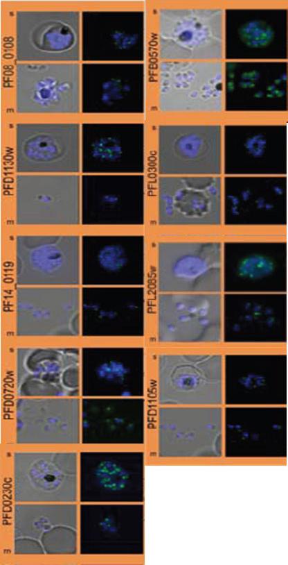 Subcellular distribution of proteins predicted to be involved in invasion. All proteins were localized in schizonts (s) and free merozoites (m) using GFP-fusion proteins and grouped according to their predominant GFP localization. Apical. Nuclei were stained with DAPI (blue).Hu G, Cabrera A, Kono M, Mok S, Chaal BK, Haase S, Engelberg K, Cheemadan S, Spielmann T, Preiser PR, Gilberger TW, Bozdech Z. Transcriptional profiling of growth perturbations of the human malaria parasite Plasmodium falciparum. Nat Biotechnol. 2010 28(1):91-8.