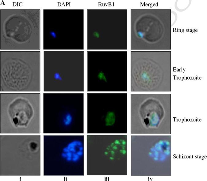 Localization of RuvB1 in P. falciparum during erythrocytic cycle by immunofluorescence staining coupled immunofluorescence microscopy. Different stages of the P. falciparum 3D7 strain parasite i.e. ring, trophozoites, schizonts and merozoites were labeled with purified anti-PfRuvB1 antibodies. The cells were fixed and immunostained. Panels (i) bright field image, (ii) image of cell stained with DAPI, (iii) immunofluorescently stained cell (green, P. falciparum RuvB1 protein) and (iv) super-imposed images. RuvB1 is expressed during all the stages. RuvB1 localized to the nuclear region and co-localizes with the DAPI in ring and trophozoite as well as schizont stage. Ahmad M, Tuteja R. Plasmodium falciparum RuvB1 is an active DNA helicase and translocates in the 5'-3' direction. Gene. 2013 Feb 15;515(1):99-109