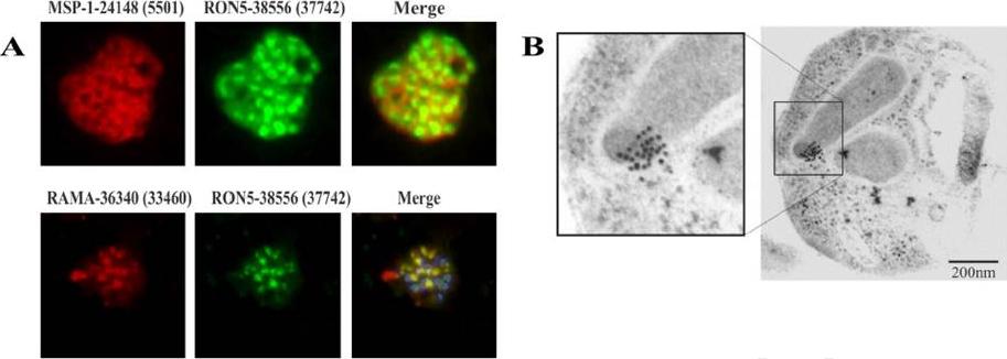 PfRON5 localizes to the rhoptry neck. (A) Aotus antibodies against MSP-1 peptide 24148 (5501) displaying the membrane, and against RAMA peptide 36340 (33460),showing the rhoptries (red fluorescence), together with RON5 peptide 38556 (37742) (green fluorescence) and DAPI (blue fluorescence, merged at the bottom), confirming RON5 localization in the rhoptries but differently to that of RAMA. (B) Immuno-electron microscopy with rabbit antibodies against RON5 peptides and protein A-gold showed specific labeling in the P. falciparum merozoite rhoptry neck. PfRON5 was detected in pear-shaped rhoptry neck portion in segmented schizonts when using rabbit polyclonal antibodies for IEM assay.Curtidor H, Patiño LC, Arévalo-Pinzón G, Vanegas M, Patarroyo ME, Patarroyo MA. Plasmodium falciparum rhoptry neck protein 5 peptides bind to human red blood cells and inhibit parasite invasion. Peptides. 2013 Aug 8. 9781(13)00268-4.