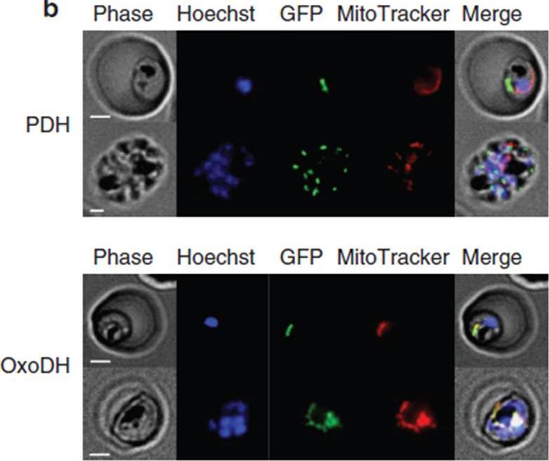 Localization of PfPDH and PfOxoDH within erythrocytes infected with 3D7 parasites. Localization of PfPDH (top panel) and PfOxoDH (bottom panel) in transgenic parasites. The left column shows phase contrast images, followed by fluorescence images of a nuclear dye (Hoechst; blue), GFP-tagged leader sequences of the target enzymes (green), a mitochondrial dye MitoTracker; red) and all four images merged together (right column). Scale bars, 2 mm. The E1-a subunit of PfPDH localizes to a discrete organelle adjacent to the mitochondrion and distinct from the nucleus, consistent with an apicoplast localization (top panel). The truncated E1 subunit of PfOxoDH, which has been predicted to have a mitochondrial localization,colocalizes with MitoTracker when fused to GFP (bottom panel), consistent with a mitochondrial localization.Chan XW, Wrenger C, Stahl K, Bergmann B, Winterberg M, Müller IB, Saliba KJ. Chemical and genetic validation of thiamine utilization as an antimalarial drug target. Nat Commun. 2013 Jun 27;4:2060.