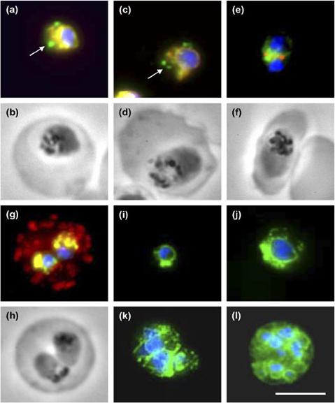 PfPDI localization in different parasite erythrocytic stages and co-localization with markers of subcellular compartments. (a,b) Immunostaining with antisera directed against rPfPDI (green) and PfBIP-PFI0875w (red) and the corresponding phase contrast image of a trophozoite. (c,d) Immunostaining with antisera directed against rPfPDI (green) and PfERC-PF11_0098 (red) and the corresponding phase contrast image of a trophozoite. (e,f) Immunostaining with antisera directed against rPfPDI (green) and PfERD2-PF13_0280 (red) and the corresponding phase contrast image of a young schizont. (g,h) Immunostaining with antisera directed against rPfPDI (green) and Pf332-PF11_0507 (red) and the corresponding phase contrast image of an erythrocyte infected by two young trophozoites. Regions of total overlapping of both proteins appear a yellow-orange color, DNA staining by DAPI appears in blue color. Arrows indicate the absence of co-localization. (i-l) Overlaid images of parasites immunostained with antiserum directed against rPfPDI (green) and incubated with the nuclear dye DAPI (blue). Parasite stages were: ring (i), old trophozoites (j), schizont (k) and mature schizont with individualized merozoites (l). Bar: 5 mm. PfPDI with endoplasmic reticulum-resident proteins, PfBIP and PfERC, but not with the Golgi marker PfERD2 or the Maurer’s cleft marker Pf332-PF11_0507.Mouray E, Moutiez M, Girault S, Sergheraert C, Florent I, Grellier P. Biochemical properties and cellular localization of Plasmodium falciparum protein disulfide isomerase. Biochimie. 2007 89:337-46. Copyright Elsevier 2009.