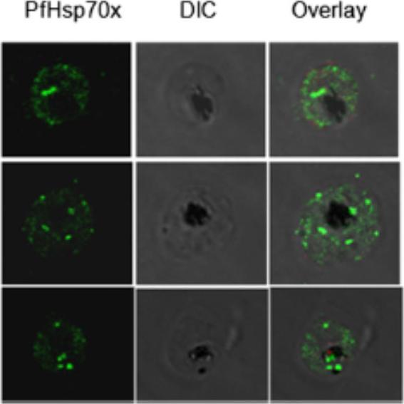 Sub-cellular localization of PfHsp70-x in infected erythrocyte. IFA analysis of infected erythrocytes with PfHsp70-x antiserum reveals its presence throughout the infected erythrocyte. the signal for PfHsp70-x can be seen as punctate spots in the erythrocyte cytosol and around the PVM apart from signal within the parasite. More amount of signal was observed on the inner side of PVM, suggesting that PfHsp70-x gets exported partially.Grover M, Chaubey S, Ranade S, Tatu U. Identification of an exported heat shock protein 70 in Plasmodium falciparum. Parasite. 2013;20:2.