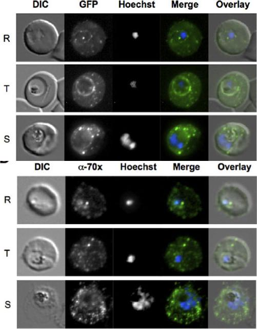 PfHsp70-x localizes to the host cell and PV. Upper panel: Live cell imaging of 3D7G:70x-infected erythrocytes. In the merge and overlay images: green, GFP; blue, Hoechst. In all stages punctate GFP fluorescence can be visualized in the host cell. Additionally, a ring of fluorescence indicative of a PV localization can also be seen. Lower panel: Indirect immunofluorescence localization of PfHsp70-x. In the merge and overlay images: green, a-70x/MRax; blue, Hoechst. R, ring stage; T, trophozoite stage; S, schizont stage.Külzer S, Charnaud S, Dagan T, Riedel J, Mandal P, Pesce ER, Blatch GL, Crabb BS, Gilson PR, Przyborski JM. Plasmodium falciparum-encoded exported hsp70/hsp40 chaperone/co-chaperone complexes within the host erythrocyte. Cell Microbiol. 2012 14(11):1784-95