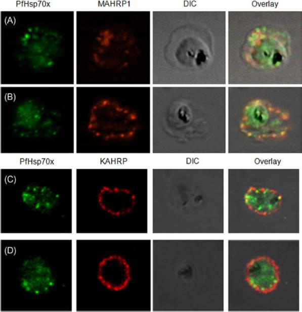 A. tage dependent co-localization of PfHsp70-x and PfEMP1. Upper infected cell (ring stage) shows a higher degree of signal colocalization than lower infected cell (trophozoite). B. ndirect immuno-fluorescence of PfHsp70-x and PfEMP1 using confocal microscopy. In merge and overlay: Green, α-70x; Red, α-ATS; Blue, Hoechst. C. ndirect immuno-fluorescence localization of PfHsp70-x using anti-SBP1, anti-MAHRP2 and anti-STEVOR (STV) antisera in cells infected with 3D7GFP:70x. In merge and overlay images: Green, GFP; red, specific antisera; Blue, Hoechst. No co-localization can be observed between the GFP and antibody-specific signals.Külzer S, Charnaud S, Dagan T, Riedel J, Mandal P, Pesce ER, Blatch GL, Crabb BS, Gilson PR, Przyborski JM. Plasmodium falciparum-encoded exported hsp70/hsp40 chaperone/co-chaperone complexes within the host erythrocyte. Cell Microbiol. 2012 14(11):1784-95