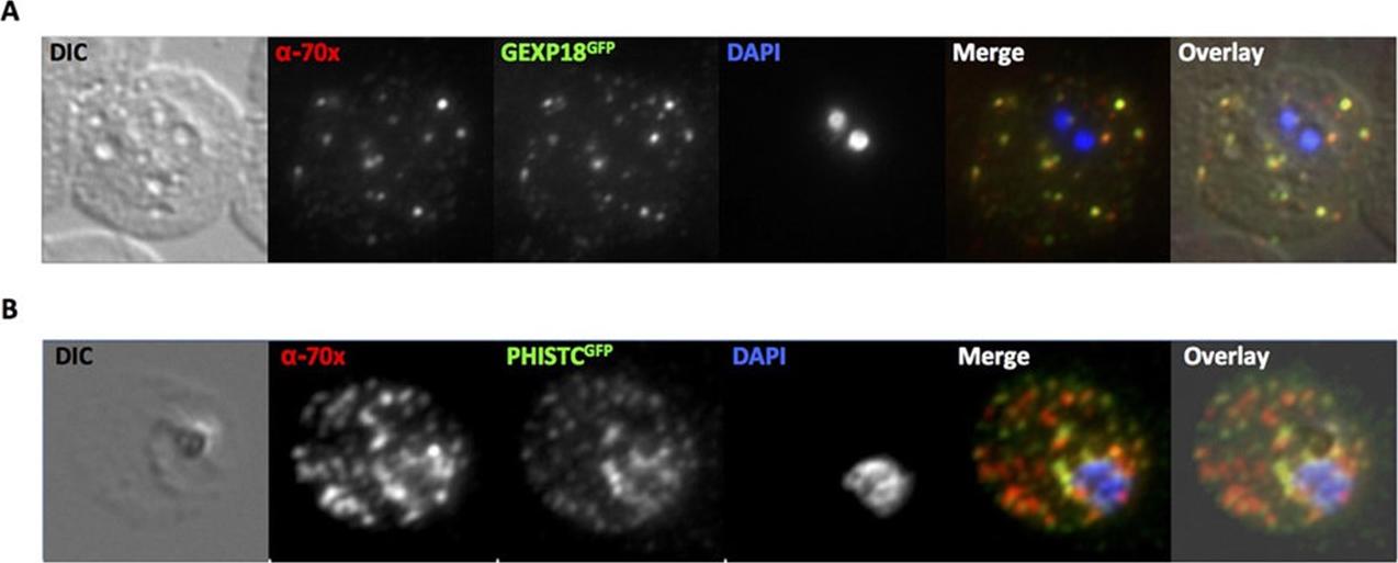 GEXP18 and PfPHIST_0801 are J-dot proteins. (A) Immunofluorescence using the J-dot marker PfHsp70x shows good colocalization with the GEXP18GFP chimera. (B) Immunofluorescence using the J-dot marker PfHsp70x shows good colocalization with PfPHIST_0801GFP. 70x, PfHsp70x; DIC, differential interference contrast, PHISTC, PfPHIST_0801. PfHsp70x and PfGEXP18 are found in a common protein complex. As PfGEXP18 is only found at the J-dots (A), this entire complex is likely to be localized to the J-dots. There is a good colocalization between PfPHIST_0801 and PfHsp70x (B) suggesting that PfPHIST_0801, as well as PfGEXP18, localizes to the J-dots.Zhang Q, Ma C, Oberli A, Zinz A, Engels S, Przyborski JM. Proteomic analysis of exported chaperone/co-chaperone complexes of P. falciparum reveals an array of complex protein-protein interactions. Sci Rep. 2017 7:42188.
