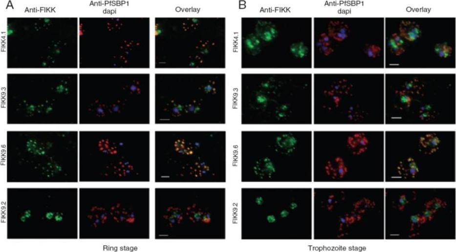 Localization by immunofluorescence of FIKK4.1, FIKK9.2, FIKK9.3 and FIKK9.6 proteins in 3D7 parasites. A and B. Ring stage (A) and trophozoite stage (B) P. falciparum-infected erythrocytes were air dried and immunolabelled with PfSBP1 antibody (red) and a FIKK-specific antibody (green). First row: polyclonal guinea pig anti-FIKK4.1; second row: polyclonal guinea pig anti-FIKK9.3; third row: polyclonal rat anti-FIKK9.6; last row: chicken anti-FIKK9.2. The third column in each panel represents the merging of the red and green channels. Yellow areas represent regions of colocalization seen on both parasitic stages for all the FIKK proteins except FIKK9.2. All proteins (not FIKK9.2) localize to the Maurer’s clefts.Nunes MC, Goldring JP, Doerig C, Scherf A. A novel protein kinase family in Plasmodium falciparum is differentially transcribed and secreted to various cellular compartments of the host cell. Mol Microbiol. 2007 63:391-403.