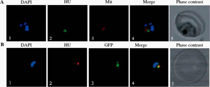 Localization of PfHU. (A) Immunolocalization of PfHU using confocal microscopy. Panels show nuclear DNA staining with DAPI (1), PfHU fluorescence (2), MitoTracker Red signal (3) and their overlap (4) in a late trophozoite. The corresponding phase–contrast scan is shown in (5). (B) Co-localization of PfHU and apicoplast-targeted GFP. Nuclear DNA stained with DAPI (1), PfHU signal (2), GFP signal (3) and their overlay (4) are shown. PfHU is associated with apicoplast DNA and is involved in DNA compaction.Ram EV, Naik R, Ganguli M, Habib S. DNA organization by the apicoplast-targeted bacterial histone-like protein of Plasmodium falciparum. Nucleic Acids Res. 2008 36(15):5061-73.