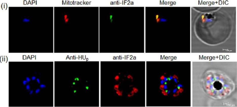 Immunofluorescence assay (IFA) with anti-PfIF2a-C serum and the mitochondrial dye Mitotracker Red CMXRos (panel i); IFA to detect the apicoplast marker protein PfHU (using PfHUp antiserum) and PfIF2a (panel ii). Parasite nuclear DNA is stained with DAPI.Haider A, Allen SM, Jackson KE, Ralph SA, Habib S. Targeting and function of proteins mediating translation initiation in organelles of Plasmodium falciparum. Mol Microbiol. 2015 Feb 17. [Epub ahead of print]