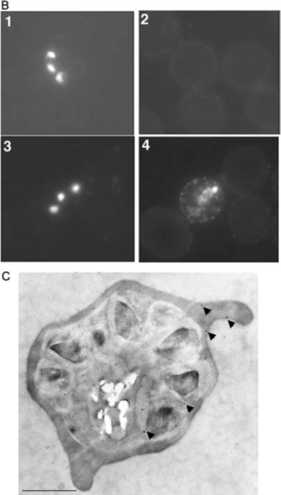 (B) Localization of native PfCuP-ATPase in trophozoite-infected erythrocytes using immuno-fluorescence microscopy: panels 1 and 3, DAPI (4,6-diamidino-2-phenylindole)-fluorescent image; panel 2, pre-immune serum (Texas-Red-labelled cells); panel 4, (Texas-Red-labelled cells) affinity-purified polyclonal antibody. The brightest signals were observed in late trophozoite and schizont stages. Signal was competed with MBP–MBD (fusion protein MBP–MBD containing the metal-binding motif Met-Thr-Cys-Asp-Asn-Cys of PfCuP-ATPase) and not MBP alone. (C) Trophozoite/schizont-infected erythrocytes were stained with antibody against PfCuP-ATPase using a gold pre-embedding immunoelectron microscopic method. The arrows indicate signals both on the parasite as well as on the erythrocyte membrane. The scale bar is 1 μm.Reproduced with permission, from Rasoloson D, Shi L, Chong CR, Kafsack BF, Sullivan DJ. Copper pathways in Plasmodium falciparum infected erythrocytes indicate an efflux role for the copper P-ATPase. Biochem J. 2004 381:803-11. © the Biochemical Society.