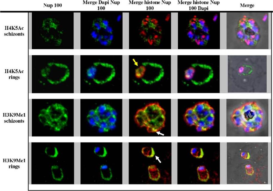 Immunofluorescence analysis of Nup 100. H3K9Me1, H4K5Ac and Nup 100 were stained red and green respectively. DAPI stained DNA blue. Yellow arrow indicates the co-localization of the H3K5Ac and Nup-100 in the ring stage parasites. White arrows indicate the co-localization of H3K9Me1 and Nup 100 outside the DAPI stained area, in the ring and schizont stage parasites.Luah YH, Chaal BK, Ong EZ, Bozdech Z. A moonlighting function of Plasmodium falciparum histone 3, mono-methylated at lysine 9? PLoS One. 2010 Apr 19;5(4):e10252