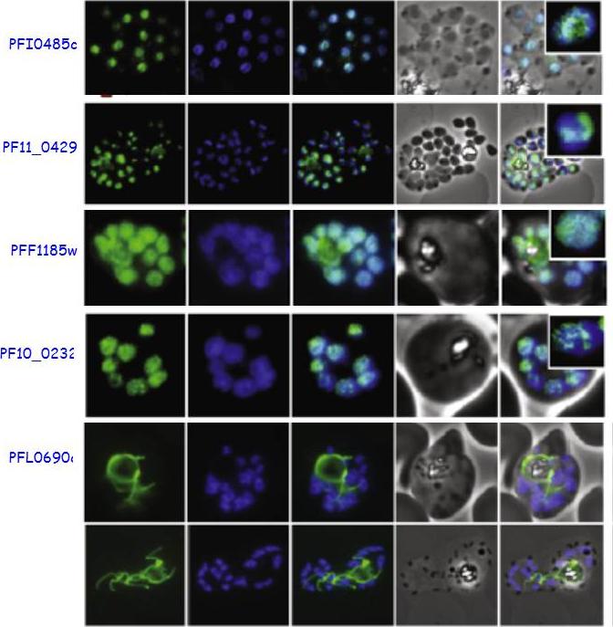 Live imaging of GFP-transgenic Plasmodium falciparum lines reveals the localization of 4 nuclear proteins, which localize to the central part of the nucleus stained by DAPI (blue panel) and the bottom one which localizes to the mitochondrion. Insets show one enlarged schizont nucleus.Volz J, Carvalho TG, Ralph SA, Gilson P, Thompson J, Tonkin CJ, Langer C, Crabb BS, Cowman AF. Potential epigenetic regulatory proteins localise to distinct nuclear sub-compartments in Plasmodium falciparum. Int J Parasitol. 2010 40(1):109-21. Copyright Elsevier