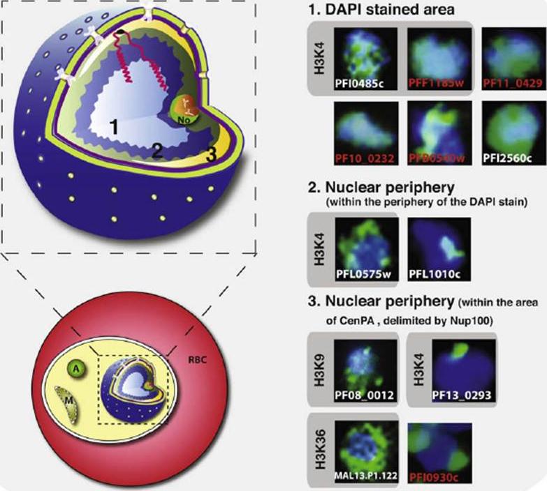 Schematic representation of the Plasmodium falciparum nuclear architecture. A schematic representation of an infected red blood cell (RBC) and an enlargement of the P. falciparum nucleus are shown. From the centre towards the periphery we have defined three distinct areas (1–3) in which nuclear proteins specifically distribute. A summary is shown in which trophozoite stages have been analyzed. Proteins, previously predicted to functionally interact, are shown in red. Proteins previously predicted for their histone target sites are indicated by grey boxes. A, apicoplast. M, mitochondria, No, nucleolus.Volz J, Carvalho TG, Ralph SA, Gilson P, Thompson J, Tonkin CJ, Langer C, Crabb BS, Cowman AF. Potential epigenetic regulatory proteins localize to distinct nuclear sub-compartments in Plasmodium falciparum. Int J Parasitol. 2010 40(1):109-21. Copyright Elsevier.