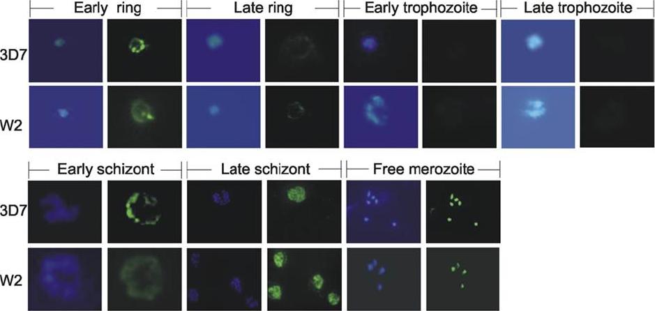 Immunolocalization of Falstatin. Immunofluorescence microscopy. Erythrocytes infected with synchronized 3D7 or W2 parasites were collected every 8 h, stained with DAPI and anti-falstatin antibodies and FITC-second antibody, and then evaluated by immunofluorescence microscopy. Falstatin is present in schizonts, merozoites, and rings, but not in trophozoites, the stage at which the cysteine protease activity of P. falciparum is maximal. Pandey KC, Singh N, Arastu-Kapur S, Bogyo M, Rosenthal PJ. Falstatin, a cysteine protease inhibitor of Plasmodium falciparum, facilitates erythrocyte invasion. PLoS Pathog. 2006 2(11):e117.