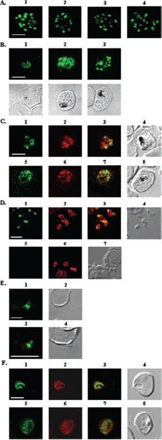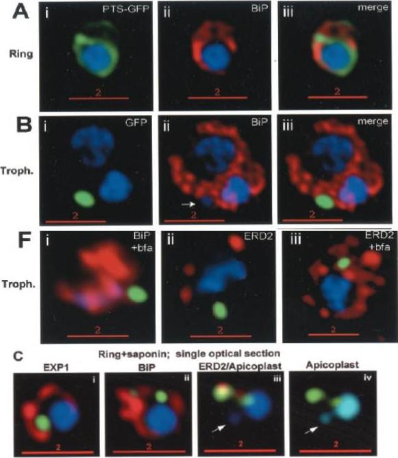 Stage-specific localization of apicoplast-targeted GFP. Distribution of green fluorescence and PfBiP (red) in a early-ring (A, i–iii) and a trophozoite (B, i–iii; a late, ~33 h, trophozoite with two nuclei stained in blue is shown). Distribution of green fluorescence and indicated secretory marker (red) in trophozoites incubated. Blue indicates DNA stained with Hoechst 33342. White arrows in B, ii, D, ii, and E, ii, indicate apicoplast DNA. Scale bars as indicated in microns. C, i–iv: single optical sections showing green fluorescence in young rings permeabilized with 0.01% saponin relative to secretory markers PfEXP1, PfBiP, PfERD2 (shown in red in i–iii), and apicoplast DNA (marked with an arrow in iii and iv), as detected by indirect. In C, iv, the Hoechst stain is pseudo-colored cyan to facilitate visualization of apicoplast DNA.Cheresh P, Harrison T, Fujioka H, Haldar K. Targeting the malarial plastid via the parasitophorous vacuole. J Biol Chem. 2002 277:16265-77.