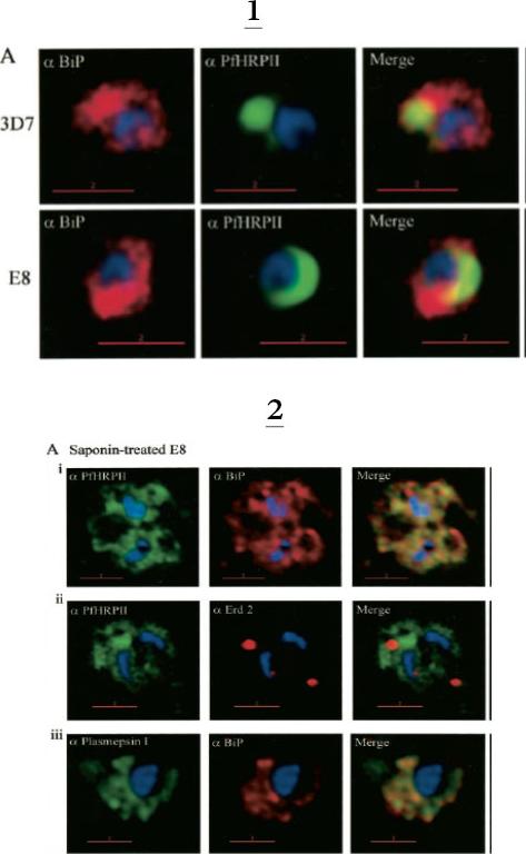 1. Comparative analysis of secretory recruitment of HRPII, export of parasite proteins in E8- and 3D7-infected erythrocytes, and distribution of total PfHRPII, PfHRPIImyc, plasmepsin I, and BiP in parasites and isolate food vacuoles. A, ring-infected red cells from E8 and 3D7-strains were treated with brefeldin A, stained for PfBiP (red), PfHRPII (green), and Hoechst dye (blue) in indirect immunofluorescence assays, and imaged using DeltaVision. Single optical sections showing a merge of red and green as yellow are shown. In the presence of BFA, all cell-associated HRPIIs detected in both E8 and 3D7 reside within regions that stain with the ER marker PfBiP, confirming that HRPII is recruited to the secretory pathway.2. Membrane association of parasite-HRPII in E8 and ACPGFP cells. A, 30–33-h trophozoite-infected red cells from 3D7 and E8 strains were attached to poly-L-lysine-coated cover slips and then permeabilized with 0.01% saponin to release the erythrocytic contents. The adherent cells were then fixed with formaldehyde and probed for the distribution of the indicated proteins by indirect immunofluorescence microscopy. HRPII and plasmepsin I show substantial colocalization with PfBiP in E8 cells but not markers of the Golgi (ERD2).Akompong T, Kadekoppala M, Harrison T, Oksman A, Goldberg DE, Fujioka H, Samuel BU, Sullivan D, Haldar K. Trans expression of a Plasmodium falciparum histidine-rich protein II (HRPII) reveals sorting of soluble proteins in the periphery of the host erythrocyte and disrupts transport to the malarial food vacuole. J Biol Chem. 2002 277:28923-33.