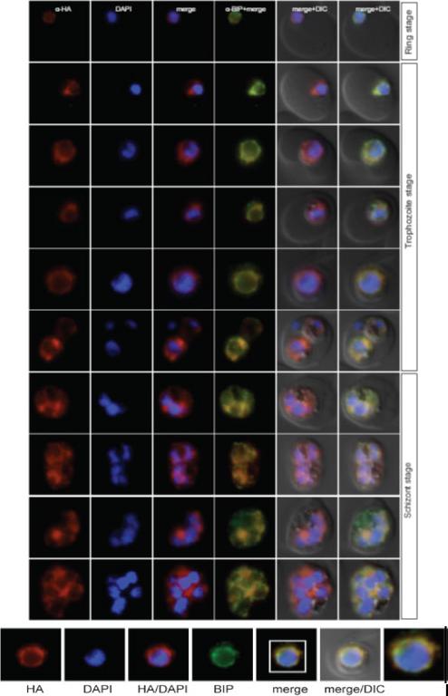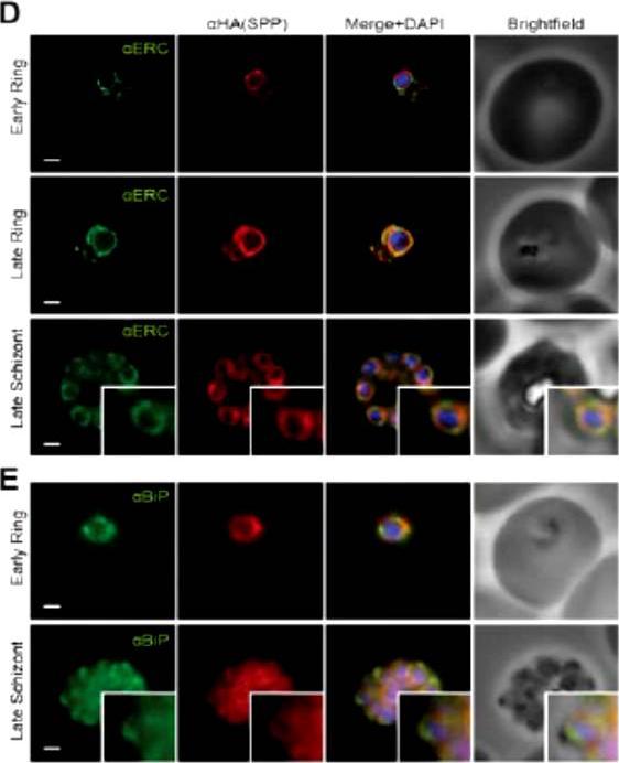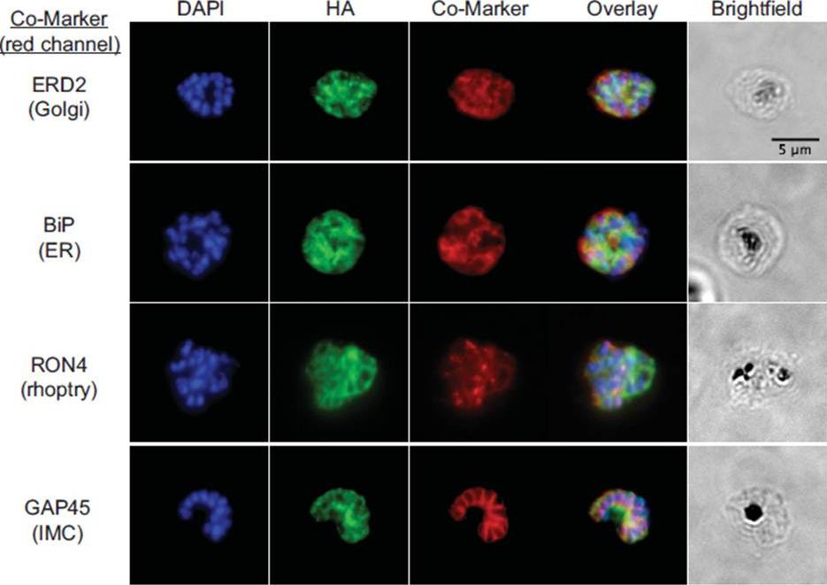fixed schizont stage parasites were stained with rat α-HA antibody and co-stained with rabbit anti-PfERD2 (1:200), rabbit anti-PfBiP (1:500), mouse anti-PfRON4 (1:100), or rabbit anti-PfGAP45 (1:1000). Primary antibodies were detected with Alexa488-conjugated goat α-rat antibody (1:1000) and Alexa555-conjugated goat α-rabbit or goat anti-mouse (1:1000).Blomqvist K, DiPetrillo C, Streva VA, Pine S, Dvorin JD. Receptor for Activated C-Kinase 1 (PfRACK1) is required for Plasmodium falciparum intra-erythrocytic proliferation. Mol Biochem Parasitol. 2016 Oct 9. pii: S0166-6851(16)30129-3.