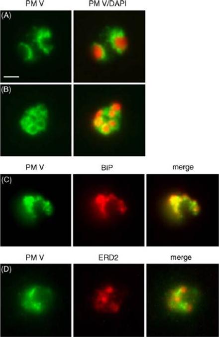 Localization of plasmepsin V (PM V). Indirect immunofluorescence assays of PM V (green) in trophozoites (A) and a ~6N schizont (B) in formaldehyde-fixed blood smears. Nuclei were visualized with DAPI (pseudocolored red). (C, D) Colocalization of PM V and the ER protein BiP (C) or the Golgi marker ERD2 (D) in trophozoites. Bar, 2 mm. In trophozoites and schizonts, PM V was concentrated around the nucleus with lower levels dispersed in the surrounding cytoplasm (Fig. 5A and B). These patterns of fluorescence suggest that PM V resides in the endoplasmic reticulum (ER), which in P. falciparum has been shown to include the nuclear envelope.Klemba M, Goldberg DE. Characterization of plasmepsin V, a membrane-bound aspartic protease homolog in the endoplasmic reticulum of Plasmodium falciparum. Mol Biochem Parasitol. 2005 143:183-191. Copyright Elsevier 2010.
