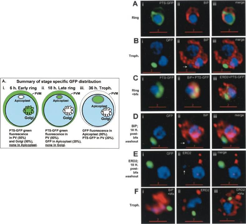 Stage-specific localization of apicoplast-targeted GFP and the effects of brefeldin A (bfa). Distribution of green fluorescence and PfBiP (red) in a early-ring (A, i–iii) and a trophozoite (B, i–iii; a late, ~33 h, trophozoite with twonuclei stained in blue is shown). Distribution of green fluorescence and indicated secretory marker (red) in: rings incubated with Bfa for 24 h (C, i–iii); rings incubated with Bfa for 24 h, washed, and grown for 18 h in absence of drug (D, i–iii; E, i–iii); and trophozoites incubated with or without Bfa (F, i–iii). Blue indicates DNA stained with Hoechst 33342. White arrows in B, ii, D, ii, and E, ii, indicate apicoplast DNA. Scale bars as indicated in microns. PTS-GFP in rings did not show significant overlap with the resident ER marker PfBiP. Nonetheless, its tubular distribution suggested that it resided in one or more membranous compartments. rings were allowed to mature in the presence of Bfa for 24 h (C, i–iii), the distribution of PTS-GFP as well as PfBiP (C, ii) were altered compared with either control rings or trophozoites shown in A and B. In the presence of Bfa, PfBiP lost its reticular staining and PTS-GFP accumulated in diffuse globular regions that show significant overlap with regions of PfBiP stain: however, PTS-GFP and BiP failed to show the identical distribution in Fig. 3C. The Golgi marker PfERD2 was also reorganized by Bfa treatment, consistent with the action of the drug on blocking transport through the Golgi (C, iii).Cheresh P, Harrison T, Fujioka H, Haldar K. Targeting the malarial plastid via the parasitophorous vacuole. J Biol Chem. 2002 277(18):16265-77.