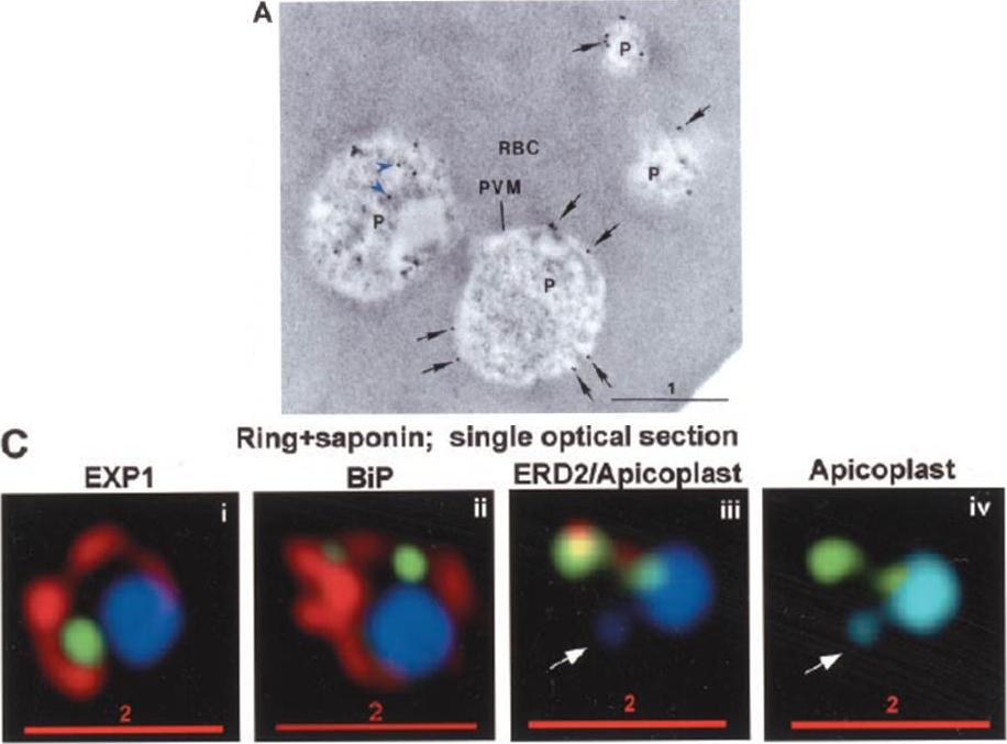 PTS-GFP is detected in the parasitophorous vacuole and in apposition with the Golgi in early rings. A, immunoelectron micrograph of rings showing localization of PTS (plastid-targeting-signal)-GFP in the parasitophorous vacuole and PVM (black arrows) as well as within the parasite (P; blue arrowheads). RBC, red blood cell. Scale bar, 1 mm.. C, i–iv: single optical sections showing green fluorescence in young rings permeabilized with 0.01% saponin relative to secretory markers PfEXP1, PfBiP, PfERD2 (shown in red in i–iii), and apicoplast DNA (marked with an arrow in iii and iv), as detected by indirect immunofluorescence and DeltaVision Microscopy. In C, iv, the Hoechst stain is pseudo-colored cyan to facilitate visualization of apicoplast DNA.Cheresh P, Harrison T, Fujioka H, Haldar K. Targeting the malarial plastid via the parasitophorous vacuole. J Biol Chem. 2002 277:16265-77.