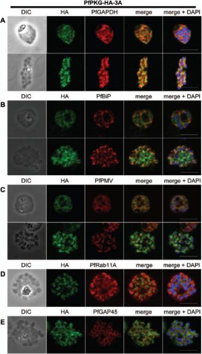 Subcellular location of PfPKG in mature schizonts. Dual immunofluorescent detection of PfPKG-HA in fixed smears of early and late schizonts of the PfPKG-HA-3A clone together with (A) GAPDH; (B) BiP; (C) PMV; (D) Rab11A and (E) GAP45. Representative images are shown for each antibody, together with bright field images (first column) and parasite nuclei stained with DAPI (in the merged image). Bars ,5 mm. Significant overlap between the PKG-HA and GAPDH in early and late blood stage schizonts (A), both are in the cytosol. PfPKG-HA also partially overlapped with that of the ER membrane protein PMV and that of the ER lumen marker PfBiP (B and C) in both early and late schizonts. Rab11A is thought to be involved in vesicle trafficking and localises to the rhoptries and the inner membrane complex (IMC) at the apical end of the merozoite. In mature schizonts, the location of PKG-HA appeared to be largely distinct from that of Rab11A (D). PKG-HA appeared to be absent from the IMC in segmented schizonts, since it did not colocalise with the IMC marker, the glideosome associated protein 45. Hopp CS, Flueck C, Solyakov L, Tobin A, Baker DA. Spatiotemporal and Functional Characterisation of the Plasmodium falciparum cGMP-Dependent Protein Kinase. PLoS One. 2012;7(11):e48206.