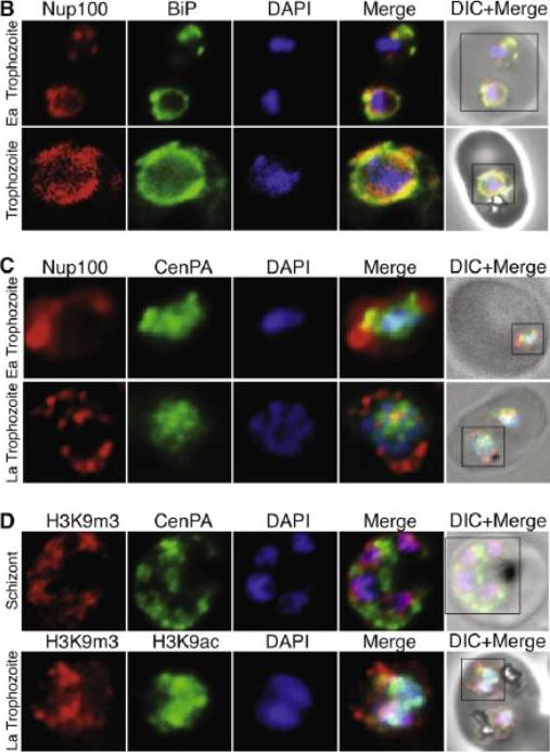 (B) Nucleoporin 100 (Nup100), a protein of the nuclear pore and BiP immunofluorescence analysis reveals the localization of Nup100 outside the DAPI stained area. Nup100 localizes in close proximity to BiP, a marker for the endoplasmic reticulum (ER) and does not overlap with DAPI, confirming that it defines the outer limits of the nucleus. (C) Localization of Nup100 and CenPA (histone 3) outside the DAPI stained area. CenPA and Nup100 do not co-localize; however, CenPA extends beyond the DAPI staining area of the nucleus suggesting that it is located within the periphery but inside the Nup100 delimited area of the nucleus (D) Localization of the histone marks H3K9m3 with CenPA and H3K9ac in the nucleus. The histone modification H3K9m3 silences transcription whereas H3K9ac is found associated with active transcription in general. H3K9m3 localized mostly to the nuclear periphery outside the DAPI stained area, which was consistent with the location of chromosome clusters containing silenced var genes. H3K9ac localized more with the DAPI stained area of the nucleus suggesting the DAPI stained area is broadly the transcriptionally active zone.Ea Trophozoite, Early Trophozoite; La trophozoite, Late Trophozoite.Volz J, Carvalho TG, Ralph SA, Gilson P, Thompson J, Tonkin CJ, Langer C, Crabb BS, Cowman AF. Potential epigenetic regulatory proteins localise to distinct nuclear sub-compartments in Plasmodium falciparum. Int J Parasitol. 2010 40:109-21. Copyright Elsevier 2010.