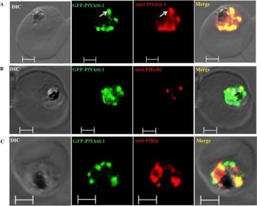 Compartmentalization of PfYkt6.1 in P. falciparum parasites. Trophozoite stage parasites exhibiting increased targeting of the PfYkt6.1 protein to organellar compartments were by confocal immunofluorescence microscopy using various organellar markers. (A) Immunofluorescence micrograph showing complete overlap between the GFP fluorescence and anti-PfYkt6.1 antibody signal in GFP-PfYkt6.1 expressing parasites. The GFP-PfYkt6.1 compartments were only partially labeled with antibodies against the Golgi marker PfErd2 (B), or the ER marker PfBip (C). Scale bars, 2μM. PfYkt6.1 appeared to be partly cytosolic and partly membrane-associated inside the parasite cytoplasm,Ayong L, Dasilva T, Mauser J, Allen CM, Chakrabarti D. Evidence for Prenylation-Dependent Targeting of a Ykt6 SNARE in Plasmodium falciparum. Mol Biochem Parasitol. 2010 175(2):162-8. Copyright Elsevier 2011.