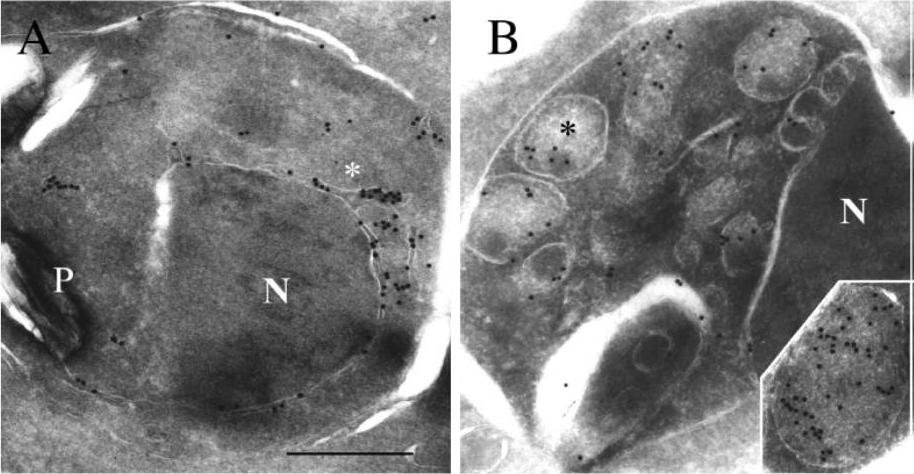 Parasite sections were incubated with rabbit anti-BiP serum and then labelled with anti-rabbit gold-conjugated IgG. (A) Untreated trophozoite stage showing gold particles lining the endoplasmic reticulum and the nuclear envelope. Note the connection between these organelles. N, nucleus; P, pigmented digestive vesicle; (*), endoplasmic reticulum. Scale bar represents 0.5 mm. (B) Brefeldin A-treated trophozoite stage. Compared with the control, the Brefeldin A-treated cells present a swollen endoplasmic reticulum. The inset shows the intense labelling of a cisternum with gold particles.Nacer A, Berry L, Slomianny C, Mattei D. Plasmodium falciparum signal sequences: simply sequences or special signals? Int J Parasitol. 2001 31:1371-9. Copyright Elsevier