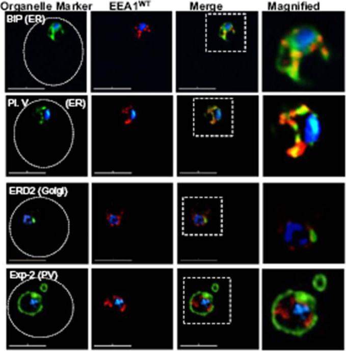 Localization of EEA1WT-mCherry as a marker for PI(3)P (phosphatidylinositol-3-phosphate) in the parasite ER. EEA1 = early endosomal antigen 1. Transgenic parasites transfected with EEA1 were fixed, permeabilized and probed with anti-mCherry as well as antibodies to endogenous P. falciparum markers (green) of the ER, like BIP (top row) and plasmepsin V (Pl. V, second row); a marker of the Golgi (ERD2, third row) or the PVM (Exp-2, bottom row). EEA1WT (red) is seen in punctuate ‘spots’ within the ER. Dotted circles show location of red cell membrane. Dotted squares show regions magnified in the right panels. Parasite nuclei were stained with Hoechst 33342 (blue). Scale bars, 5 mm. The overlap between markers and EEA1 indicates the presence of PI(3)P in the respective regions.Bhattacharjee S, Stahelin RV, Speicher KD, Speicher DW, Haldar K. Endoplasmic Reticulum PI(3)P Lipid Binding Targets Malaria Proteins to the Host Cell. Cell. 2012 148(1-2):201-12.