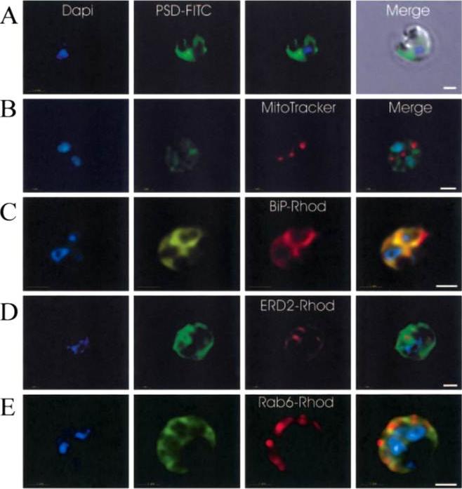 Immunofluorescence localization of PfPSD within P. falciparum-infected erythrocytes. A. FITC (which labels PfPSD) and DAPI (which labels nuclei) images were merged with the Nomarsky image to show the location of PSD labelling in the parasite. DAPI and FITC images were merged with the rhodamine channel corresponding to MitoTracker that labels the mitochondrion (B), BiP (PFI0875w)-rhodamine that labels the ER (C), ERD2 (PF13_0280)-rhodamine that labels the cis-Golgi (D) or Rab6 (PF11_0461)-rhodamine that labels the trans-Golgi (E). All the images except (A) correspond to one selected z-section image after digital deconvolution. The bar corresponds to 1 mm. The entire PfPSD labelling was clearly co-localized with the BiP endoplasmic reticulum marker.Baunaure F, Eldin P, Cathiard AM, Vial H. characterization of a non-mitochondrial type I phosphatidylserine decarboxylase in Plasmodium falciparum. Mol Microbiol. 2004 51:33-46. Copyright John Wiley & Sons Ltd. 2010.