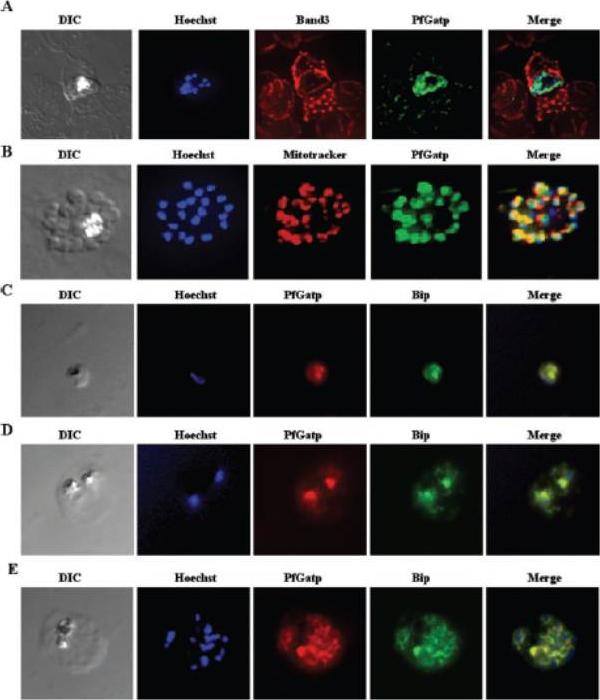 Immunofluorescence microscopy of P. falciparum-infected red blood cells using PfGatp antibodies. A, double-labeling schizont with PfGatp- and Band 3-specific antibodies. In green, PfGatp conjugated to the FITC-conjugated goat anti-rabbit secondary antibody. In red, Band 3 conjugated to the Texas Red-conjugated anti-mouse secondary antibody. B, double-labeling with PfGatp-specific antibodies and MitoTracker. DNA was counterstained with Hoechst. C–E, double-labeling at the ring (C), trophozoite (D), and schizont (E) stages with PfGatp- (red) and BiP-specific antibodies (green). Yellow represents regions of overlap between red and green. The PfGatp signal was proximal and only partly overlapping with MitoTracker (B), whereas the signals of PfGatp and BiP completely overlapped in all the three stages (C–E). Collectively, these data suggest that PfGatp is a component of the endoplasmic reticulum. This staining was proximal to the nucleus as revealed by Hoechst labeling.Santiago TC, Zufferey R, Mehra RS, Coleman RA, Mamoun CB. The Plasmodium falciparum PfGatp is an endoplasmic reticulum membrane protein important for the initial step of malarial glycerolipid synthesis. J Biol Chem. 279:9222-32.