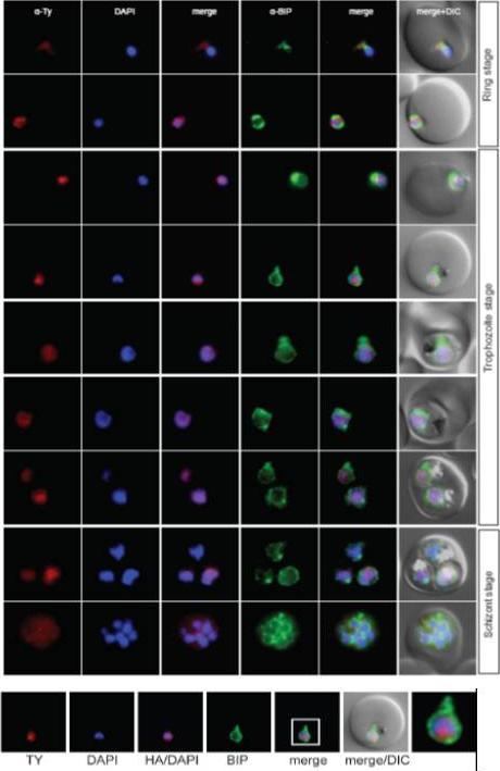 Localisation of PFL0625c during the IDC. Localisation of the tagged protein was visualised using anti-Ty antibodies (red). Antibodies against PfBIP were used to visualise the ER. DAPI was used to visualise the nucleus. DIC images are shown as reference. The bromodomain protein with a more restricted and peripheral localization in ring stages and a diffuse nuclear pattern in trophozoites and schizonts.Oehring SC, Woodcroft BJ, Moes S, Wetzel J, Dietz O, Pulfer A, Dekiwadia C, Maeser P, Flueck C, Witmer K, Brancucci NM, Niederwieser I, Jenoe P, Ralph SA, Voss TS. Organellar proteomics reveals hundreds of novel nuclear proteins in the malaria parasite Plasmodium falciparum. Genome Biol. 2012 Nov 26;13(11):R108.