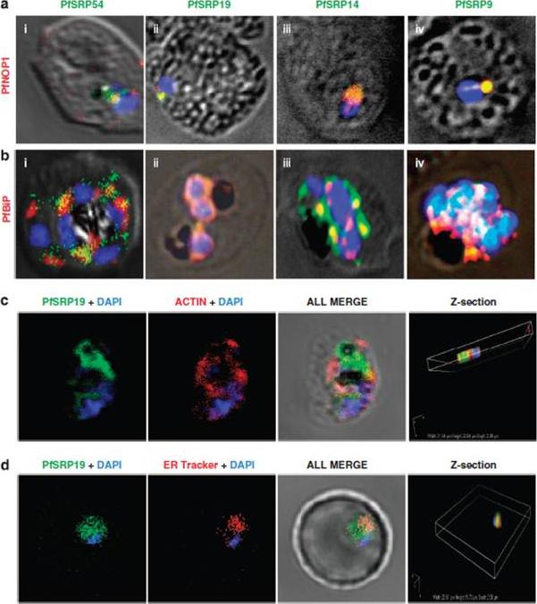 Co-staining of PfSRP polypeptides with nucleolar marker PfNOP1, ER marker PfBiP and cytoplasmic marker Pfactin. (a, b and c) P. falciparum infected erythrocytes stained with anti-PfSRP antibodies (green), anti-PfNOP1 (red), anti-PfBiP (red) and anti-Pfactin (red) respectively. (d) localization of GFP fused SRP19 (green) with ER tracker (red). DAPI is used for nuclear staining (blue). A considerable overlap in staining was observed between three PfSRP polypeptides; PfSRP19, -14, and -9 with PfNOP1 and with PfBiP protein (a and b, i-iv). Importantly, considerable co-localization of PfSRP54 with PfNOP1 in early stages of parasite development i.e. merozoite and ring stages.Panchal M, Rawat K, Kumar G, Kibria KM, Singh S, Kalamuddin M, Mohmmed A, Malhotra P, Tuteja R. Plasmodium falciparum signal recognition particle components and anti-parasitic effect of ivermectin in blocking nucleo-cytoplasmic shuttling of SRP. Cell Death Dis. 2014 Jan 16;5:e994.