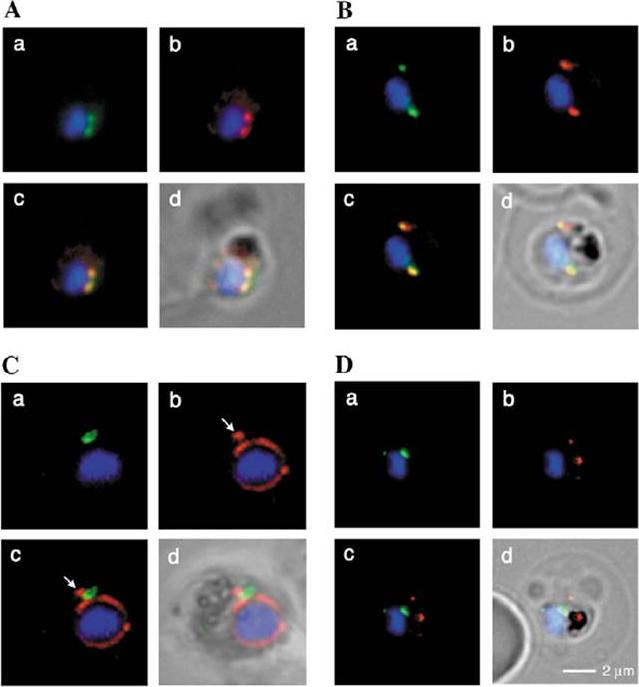 Fluorescence microscopy on fixed parasites. (A) PfGRASP-GFP colocalises with antiPfGRASP-specific antibodies. PfGRASP-GFP is tightly confined to two compartments (a, green) near the parasite nucleus (a, blue). AntiPfGRASP-specific antibodies show a similar staining pattern (b, red with nucleus in blue). Merged image shows identical colocalisation. (B) PfGRASP-GFP colocalises with the cis-Golgi marker ERD2. PfGRASP-GFP (a, green) accumulates in two discrete compartments in close proximity to the nucleus (a, blue). Anti-PfERD2 antibodies recognize similar structures (b, red with nucleus in blue). Merged image shows colocalisation of compartments (c, yellow). (C) PfGRASP-GFP defines a compartment that is distinct from the ER. At the early stages of the parasite life cycle (<16 hours post invasion) PfGRASP is restricted to one compartment (a, green) juxtapose to the nucleus (a, blue). The ER is visualised by anti-PfBiP-specific antibodies (b, red). The membranous system of the ER forms an envelope around the nucleus (b, blue) with one protrusion (indicated by arrow). Merged image shows no colocalisation of the two compartments (c). (D) PfGRASP-GFP does not colocalise with the trans-Golgi marker PfRab6. PfGRASP accumulates in two discrete foci (a, green) adjacent to the nucleus (a, blue). Antibodies against PfRab6 visualise two distinct sites within the parasite (b, red with nucleus in blue). Merged image shows no colocalisation of the PfGRASP defined compartment with PfRab6 (c).Struck NS, de Souza Dias S, Langer C, Marti M, Pearce JA, Cowman AF, Gilberger TW. Re-defining the Golgi complex in Plasmodium falciparum using the novel Golgi marker PfGRASP. J Cell Sci. 2005 118(Pt 23):5603-13.