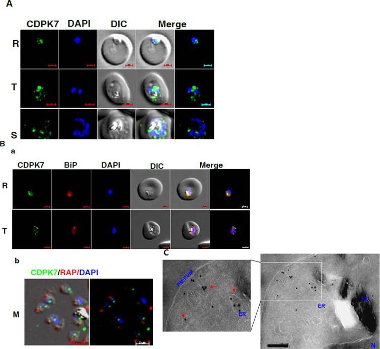 CDPK7 may be present in the ER and vesicles. A IFA was performed to localize CDPK7 in various asexual stages of the parasite using antisera against CDPK7. R, rings; T, trophozoites; S, schizonts. B. Co-staining was done using antisera against CDPK7 and BiP on trophozoites (a) or with anti-RAP1 mAb on free merozoites (b). C. Immuno-EM performed on a trophozoite stage parasite indicated the presence of CDPK7 in ER and vesicular compartments (arrows). Various parasite organelles are indicated: FV, food vacuole; PM/PVM, parasite membrane/parasite vacuolar membrane; ER, Endoplasmic Reticulum; N, Nucleus.Kumar P, Tripathi A, Ranjan R, Halbert J, Gilberger T, Doerig C, Sharma P. Regulation of Plasmodium falciparum development by Calcium-Dependent Protein Kinase 7 (PfCDPK7). J Biol Chem. 2014 Jun 3. [Epub ahead of print]